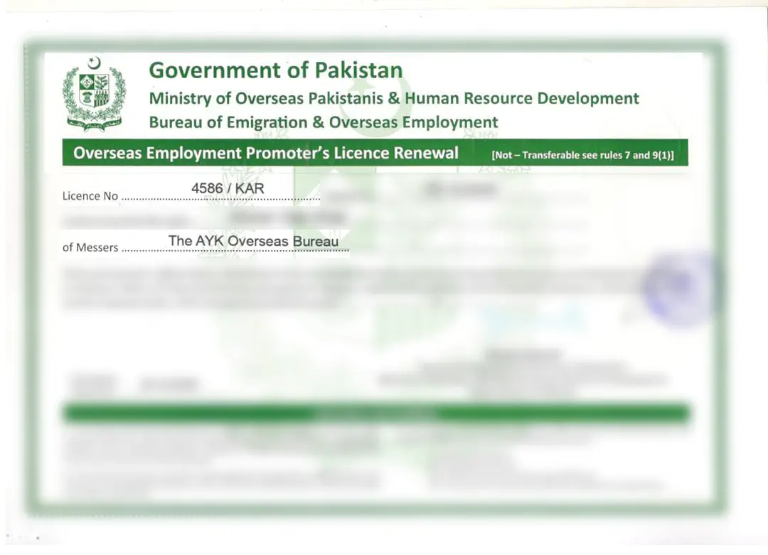 Verify Recruitment Agency Registration for The AYK Overseas Bureau GL-4586-KAR below. Our Overseas employment promoter License is valid as Pakistani Recruiter for Gulf countries. We provide recruiting service for Oman, UAE, Saudi Arabia, Kuwait and other GCC members. Hire legitimate manpower recruiters in Pakistan. Contact us today with your Requirements.
